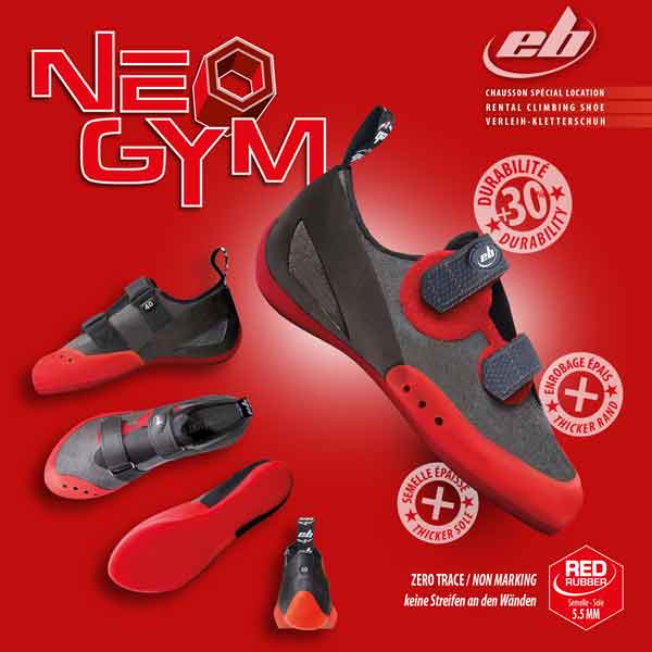 EB presents its new climbing for 2017 designed specifically for climbing gyms, the NEO GYM. The idea came out after hearing the expectations from the climbing gyms about their rental shoes.
